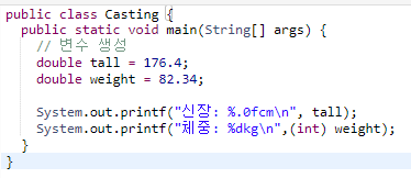 -신장은 소수점자리를 없애서 정수형처럼 보여지게 한 것이고, 체중은 형변환을 통해 정수형 출력된 것