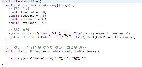 해당 오디션 평가 점수의 곱이 70 이상일때 합격 반환 / 미만일때는 불합격 반환하는 코드