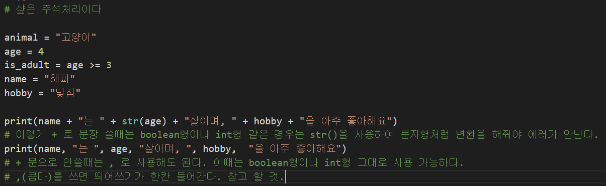 print(name + "는 " + str(age) + "살이며, " + hobby + "을 아주 좋아해요")