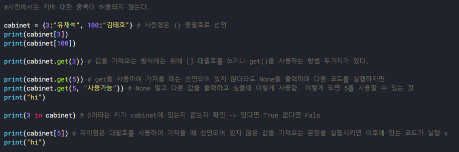 print(cabinet.get(3)) # 값을 가져오는 방식에는 위에 [] 대괄호를 쓰거나 get()을 사용하는 방법 두가지가 있다.