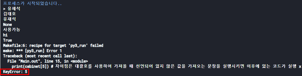 print(cabinet[5]) # 차이점은 대괄호를 사용하여 가져올 때 선언되어 있지 않은 값을 가져오는 문장을 실행시키면 이후에 있는 코드가 실행 x