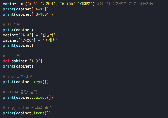 cabinet = {"A-3":"유재석", "B-100":"김태호"} #이렇게 문자열도 키로 사용가능