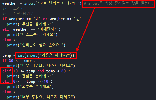 weather = input("오늘 날씨는 어떄요? ") # input은 항상 문자열로 값을 받는다.
