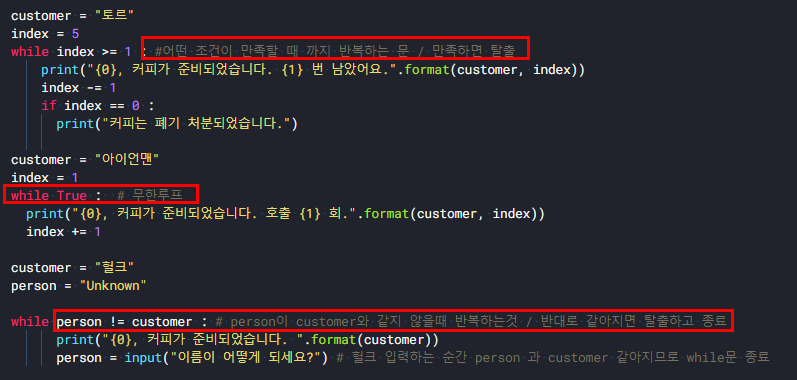 while person != customer : # person이 customer와 같지 않을때 반복하는것 / 반대로 같아지면 탈출하고 종료